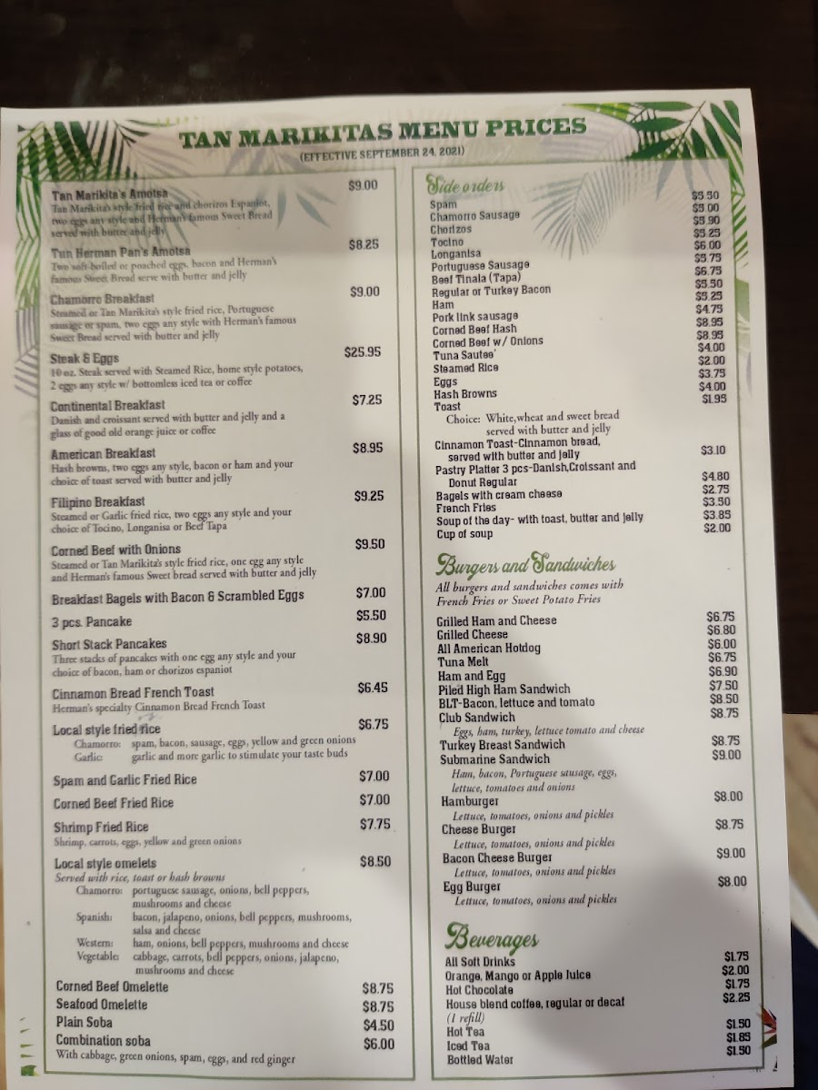 Tan Marikita's Cafe Menu